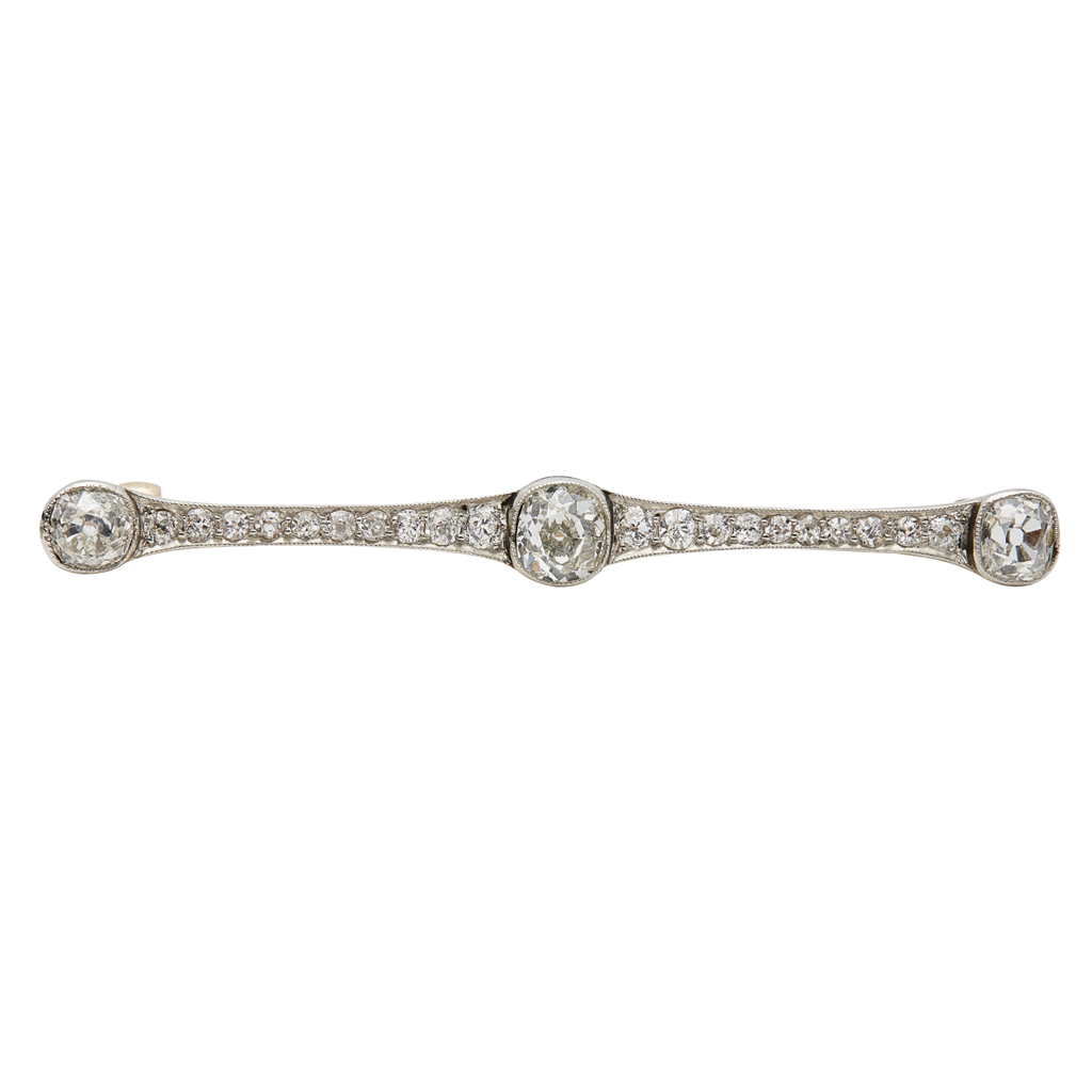 millegrain set with three cushion cut diamonds, interspaced with graduated old-round cut diamonds, unmarked