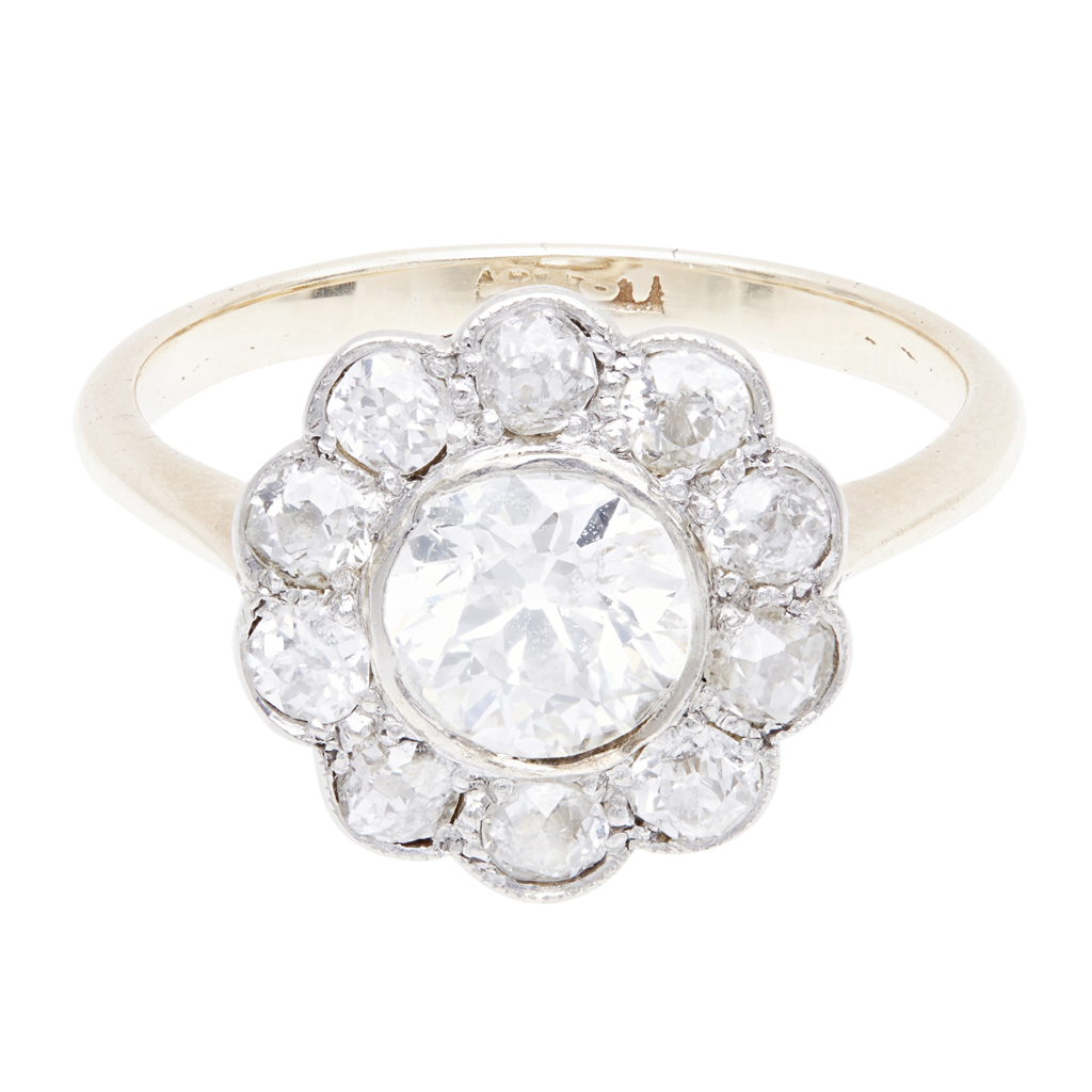 collet set with an old-round cut diamond, in a border of old-round and cushion cut diamonds, to a plain shank stamped 18ct