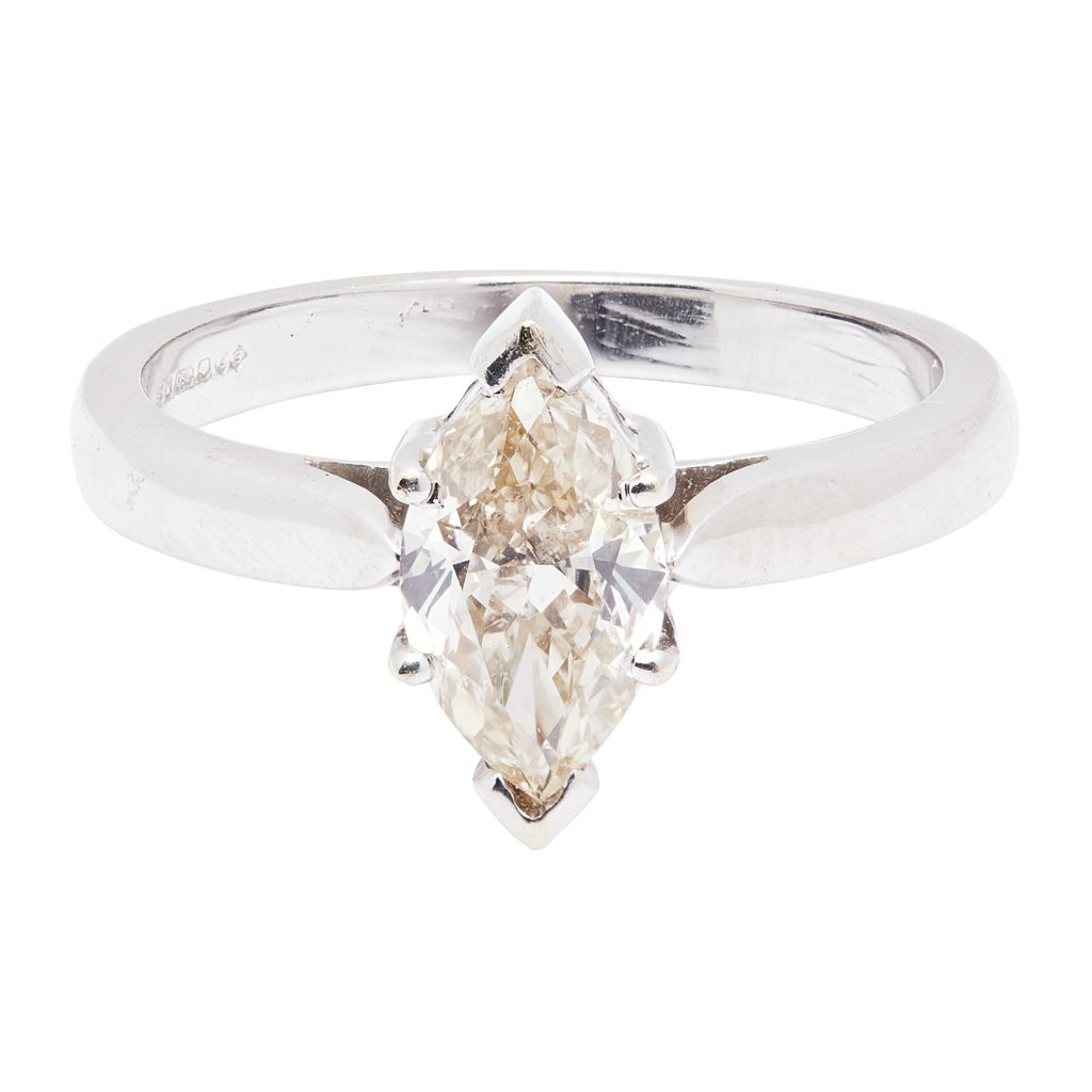 claw set with a single marquise cut diamond, to a plain 18ct gold shank
