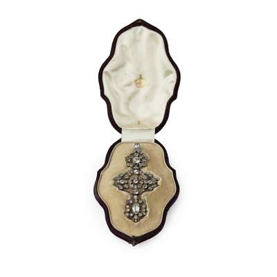 composed of three pierced scrolling panels, set throughout with colourless paste, to a velvet ribbon necklace, in a fitted box