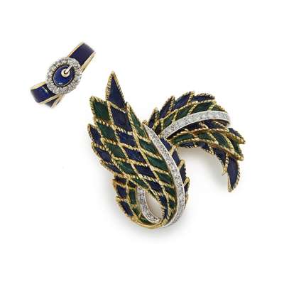 of stylised sweeping design, with blue and green enamel detail to ground, set with a row of eight cut diamonds; together with an 18ct gold blue enamel and diamond set ring, modelled as a buckle (2)