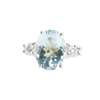 claw set with an oval mixed cut aquamarine, flanked to either side by a round-brilliant cut diamond, to a plain 18ct white gold shank