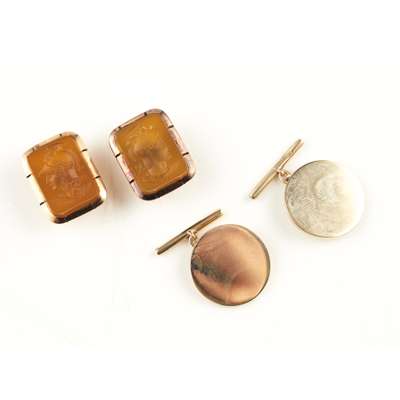 each set with a rectangular hardstone intaglio depicting a Roman/Greek soldier in profile, French marks to secondary terminals; together with a pair of plain 9ct gold circular cufflinks, with secondary T-bar terminals (2)