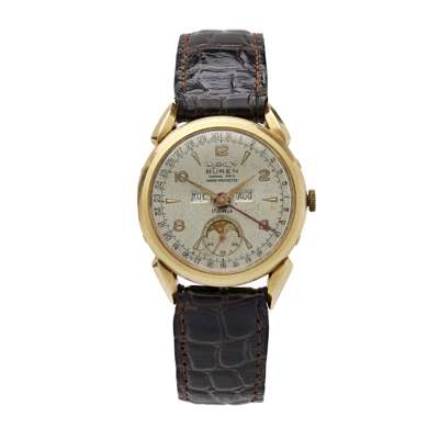 Grand Prix with complications, triple date calendar, with moon phase, gilt Arabic and baton indicators, dial inscribed and also in Arabic 'Holy Mecca', circa 1950s, leather strap