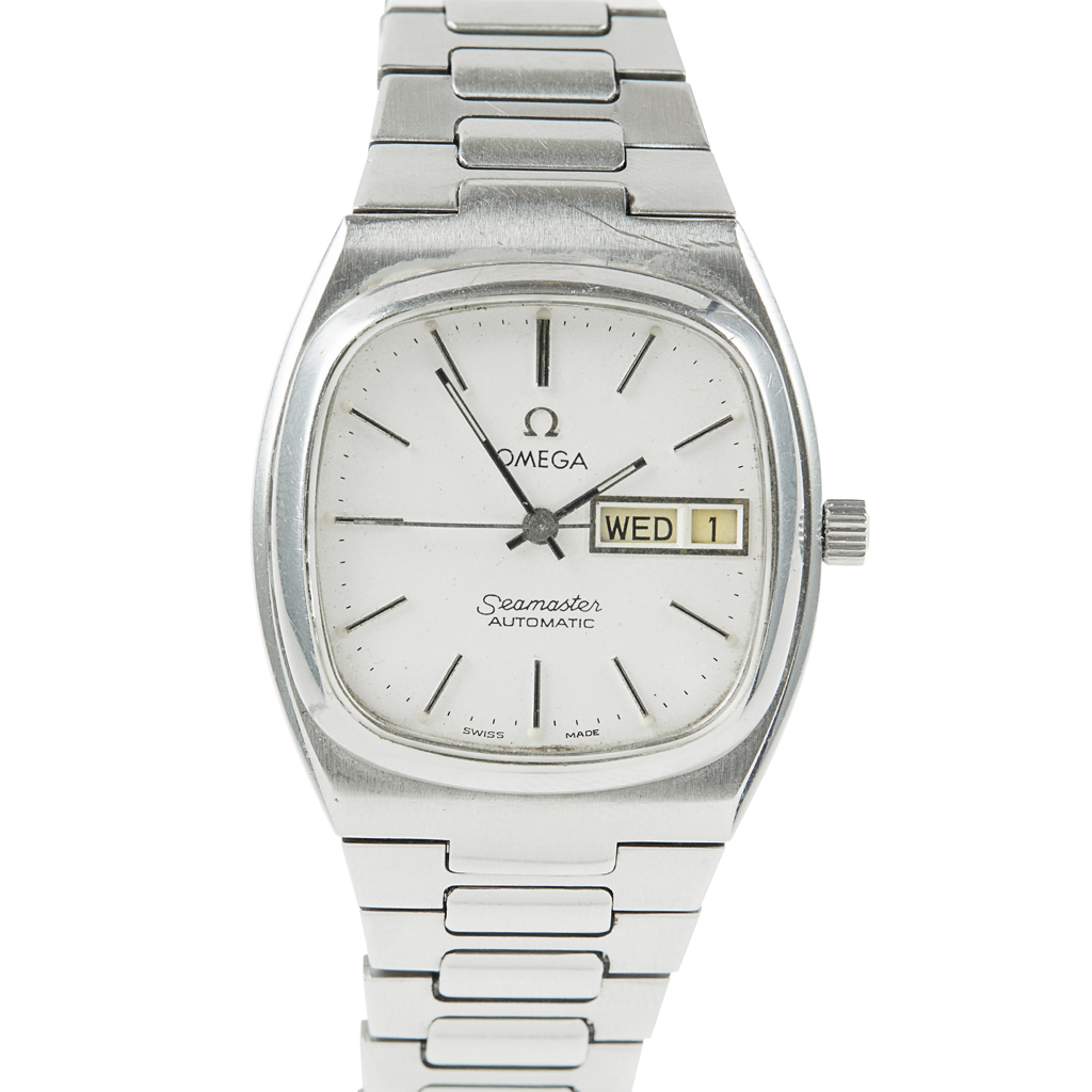 Seamaster, the rounded square dial with baton indicators, day and date apertures, polished bezel, satin finished integral bracelet, fold over clasp
