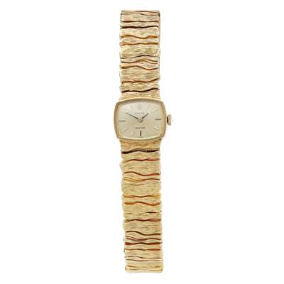 Ref. 1400, champagne dial, baton indicators, rounded rectangular form, manual movement, integral gold bark effect heavy bracelet, fold over clasp