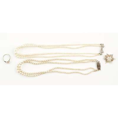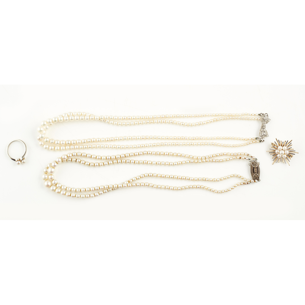to include a bi-coloured 9ct gold pearl set brooch, a cultured pearl twist ring; together with a double strand of cultured pearls with diamond set clasp and a double strand of cultured pearls with a marcasite set clasp (4)