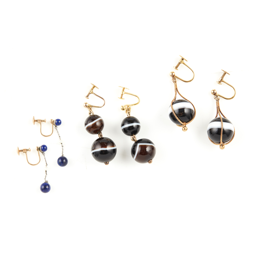 to include two pairs of pendant earrings set with banded agate beads, and a pair of seed pearl and lapis lazuli set pendant earrings (3)