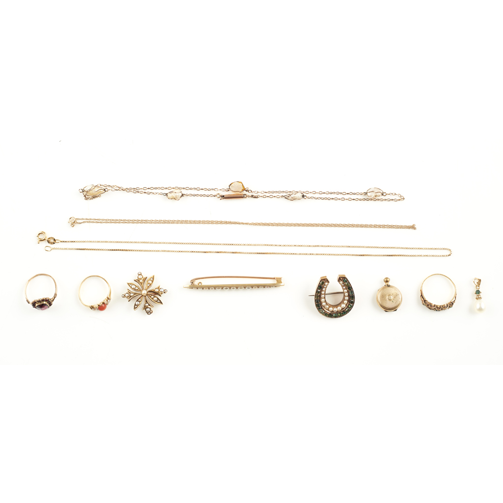 to include a seed pearl and emerald set horseshoe brooch, a seed pearl bar brooch, a seed pearl floral brooch, a garnet set ring, two multi-gem set rings and a locket; together with a pearl and emerald set pendant, an 18ct yellow gold chain, a trace link chain stamped 375 and a pearl necklace (qty)