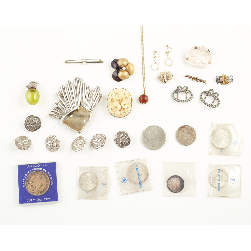 depicting a woman in profile, stamped 14; together with an enamel and pearl set pansy brooch, with locket to reverse, unmarked; a set of six art nouveau silver buttons, a small glass scent bottle with hawks head detail, unmarked; a pair of seed pearl set earrings, various other brooches and coins etc (qty)