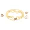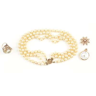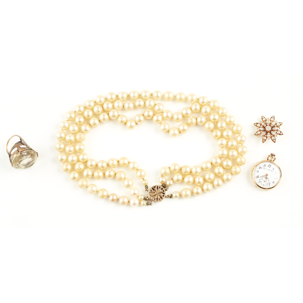 to include a seed pearl and diamond set floral brooch, stamped PEACOCK to reverse; a small lady's fob watch, dial signed Theodore B Starr, stamped 14k; a large citrine set cocktail ring and a triple strand of imitation pearls (4)