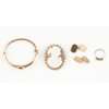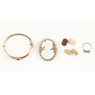 claw set with three graduated old-round cut diamonds, to a plain, unmarked white metal shank; together with a cased pair of 9ct gold gentleman's cufflinks; a cameo brooch, depicting a classical woman in profile, stamped 9c; and a late Victorian seed pearl set 'horseshoe' bangle (4)