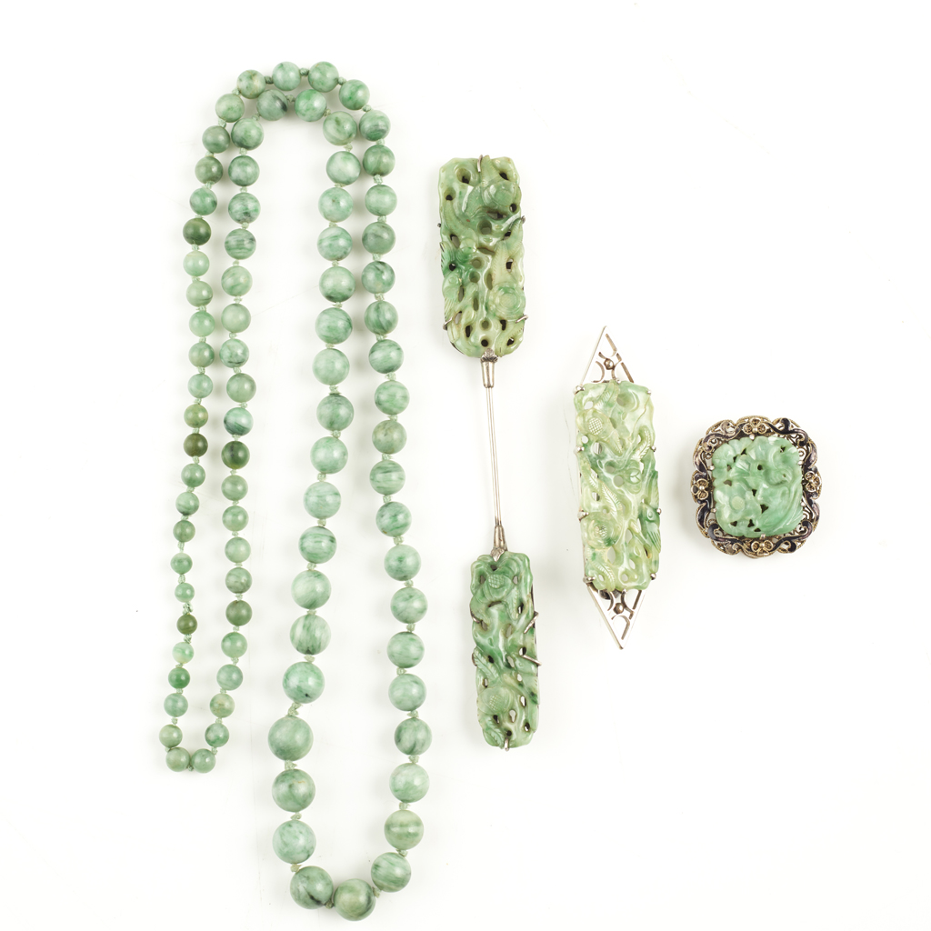 to include a graduated bead necklace; a jabot pin, each terminal set with a carved jade panel; and two brooches of similar design (4)