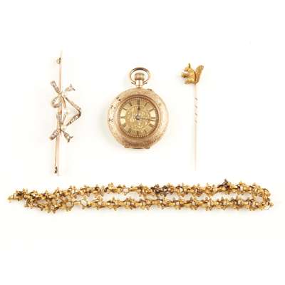 modelled as a squirrel holding a cultured pearl, stamped 18; together with a textured link bracelet, apparently unmarked; a pearl and diamond set double bow bar brooch and a lady's enamel fob watch stamped 14k (4)