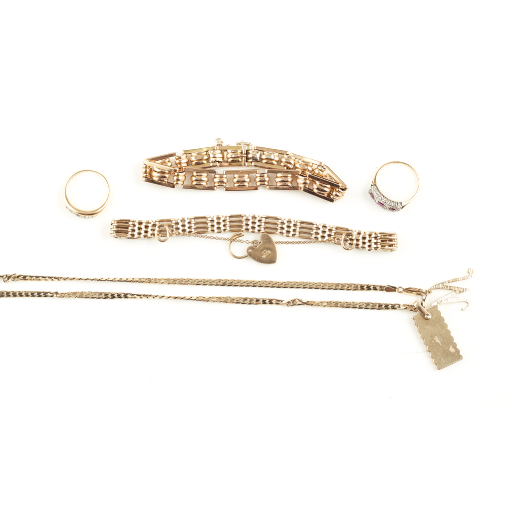 to include an 18ct gold five stone diamond set ring, a ruby and diamond set cluster ring, unmarked; a 9ct gold gate-link bracelet with padlock clasp, a 9ct gold flattened curb link chain with ingot pendant, and a 'M' pendant, stamped 9ct, a fancy link bracelet, stamped 15 (5)