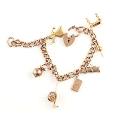 composed of curb links and a padlock clasp, suspending various charms, including a wheelbarrow, golf clubs, etc. clasp stamped 9C