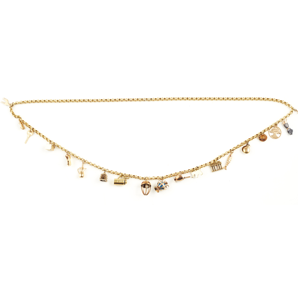 composed of circular belcher links, suspending various charms including a tea cup, a key, a pair of castanets etc.
