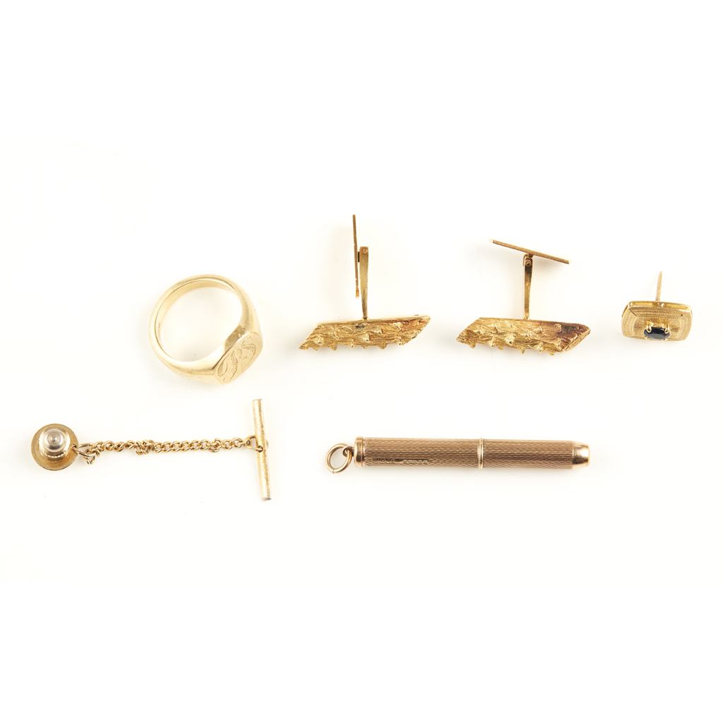 to include an 18ct gold signet ring, and pair of 18ct gold bark effect cufflinks; a 9ct gold cased toothpick with engine turned detail; together with a sapphire set pin, stamped 750 (4)