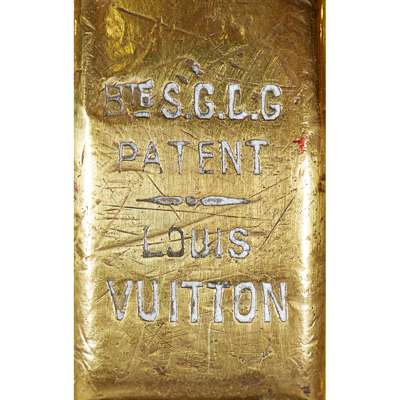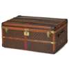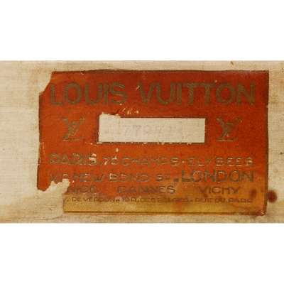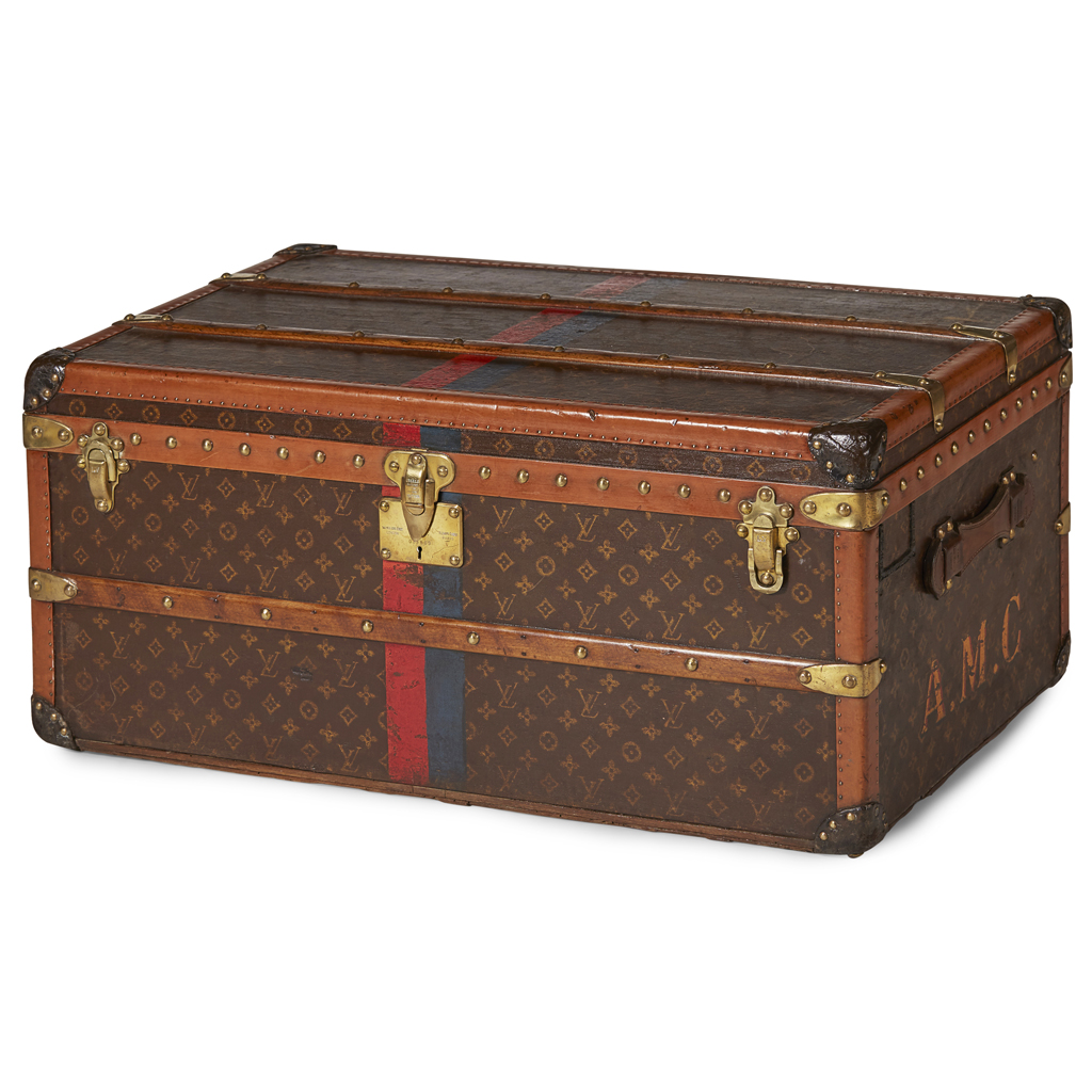 covered in signature monogram canvas with brown leather trim, wood straps and brass stud details, stamped brass hardware and leather strap handles; the linen lined interior with a tray with stamped buckles, paper label and faded serial no., the exterior personalised with a blue and red stripe and initials A.M.C.