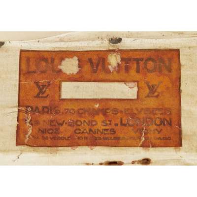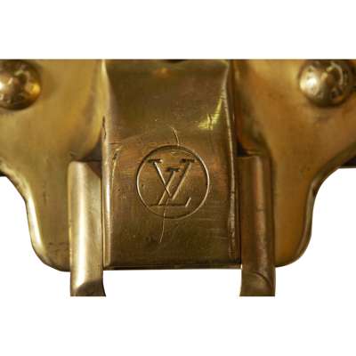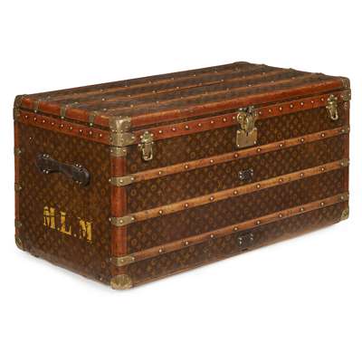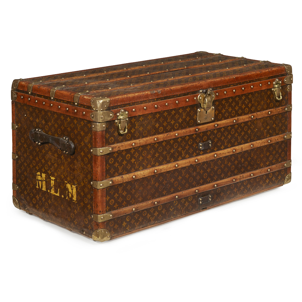 covered in LV monogram leather with brown leather corners and ash strap with brass stud detail, LV stamped brass hardware, the void canvas lined interior with a paper label and serial no. [faded]; with personalised initials M.L.M.