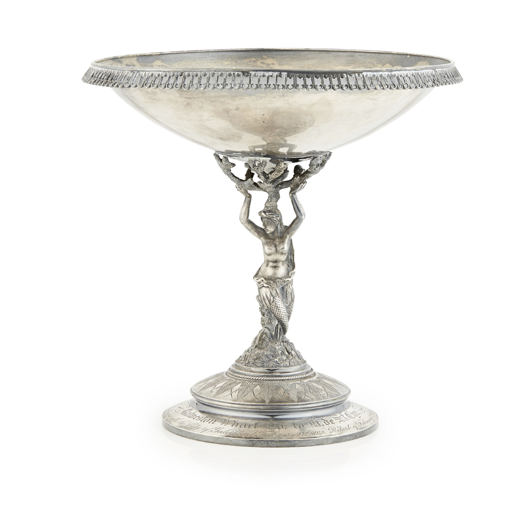 attributed to Charles Osborne for the Whiting Manufacturing Company, the stem modelled as a mermaid supporting the bowl with pierced border, raised on a spreading stepped foot with presentation engraving 'Galveston Wharf Co. to H. de St. Cyr... February 27th 1874'