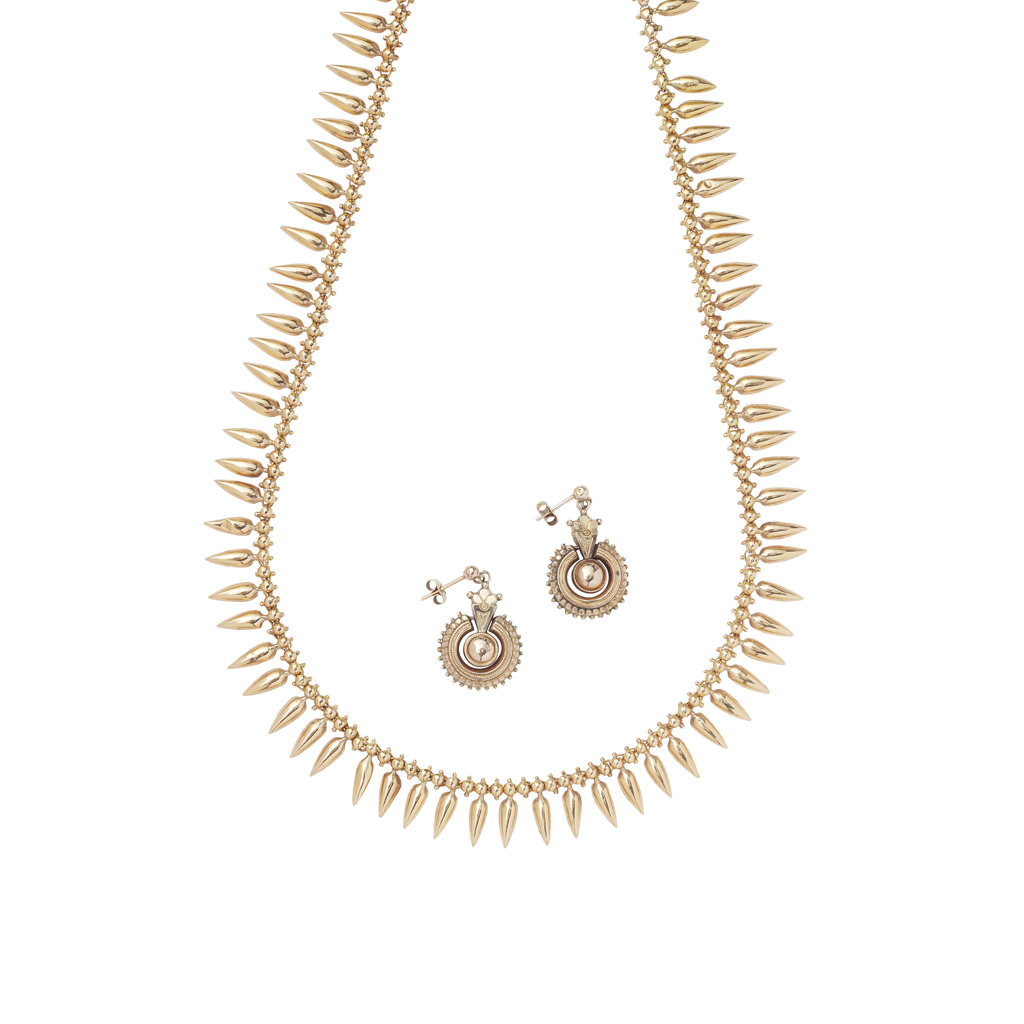 of lozenge fringed design, to a box clasp and safety chain with continental marks; together with a pair of Victorian pendant earrings (2)