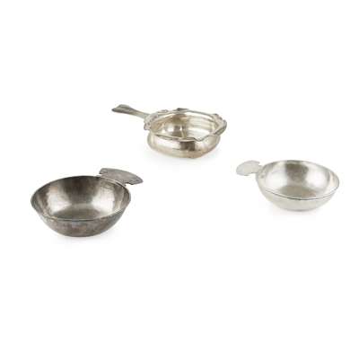 of plain planished form; the bowl of square from folded over and crimped rim, beaten body and flat shaped handle; together with another, from Kalo shop, of circular form, curved handle with floral detail; another plainer, planished finish (3)