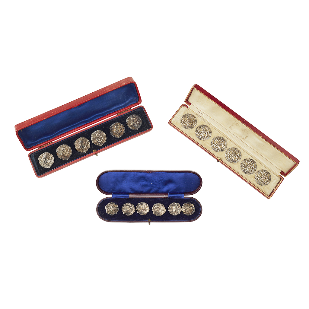 the first set, Deakin & Francis Birmingham 1903, pierced decoration of scrolling flowers; the second set, RF (Incuse), import marks for Birmingham 1906, decorated in relief with a young girl holding flowers; third set, WHL, Chester 1902, each of serpentine outline, each decorated with a young lady's head with flowers, all in original fitted cases (3)