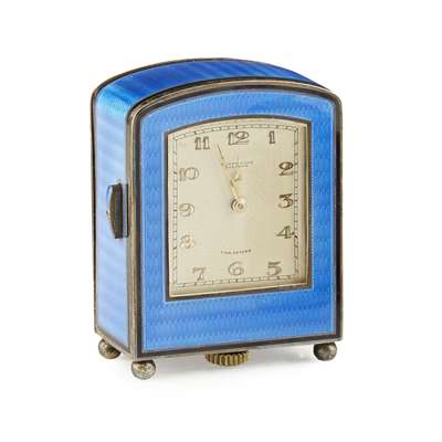 marked 935 the arched case with light blue guilloche enamel panelled front and sides with black border, conforming gilt dial inscribed Henry Captain Genève, push button to the side for the quarter repeat action, the rear cover hinges down to reveal enclosed Swiss movement, the whole raised on ball feet