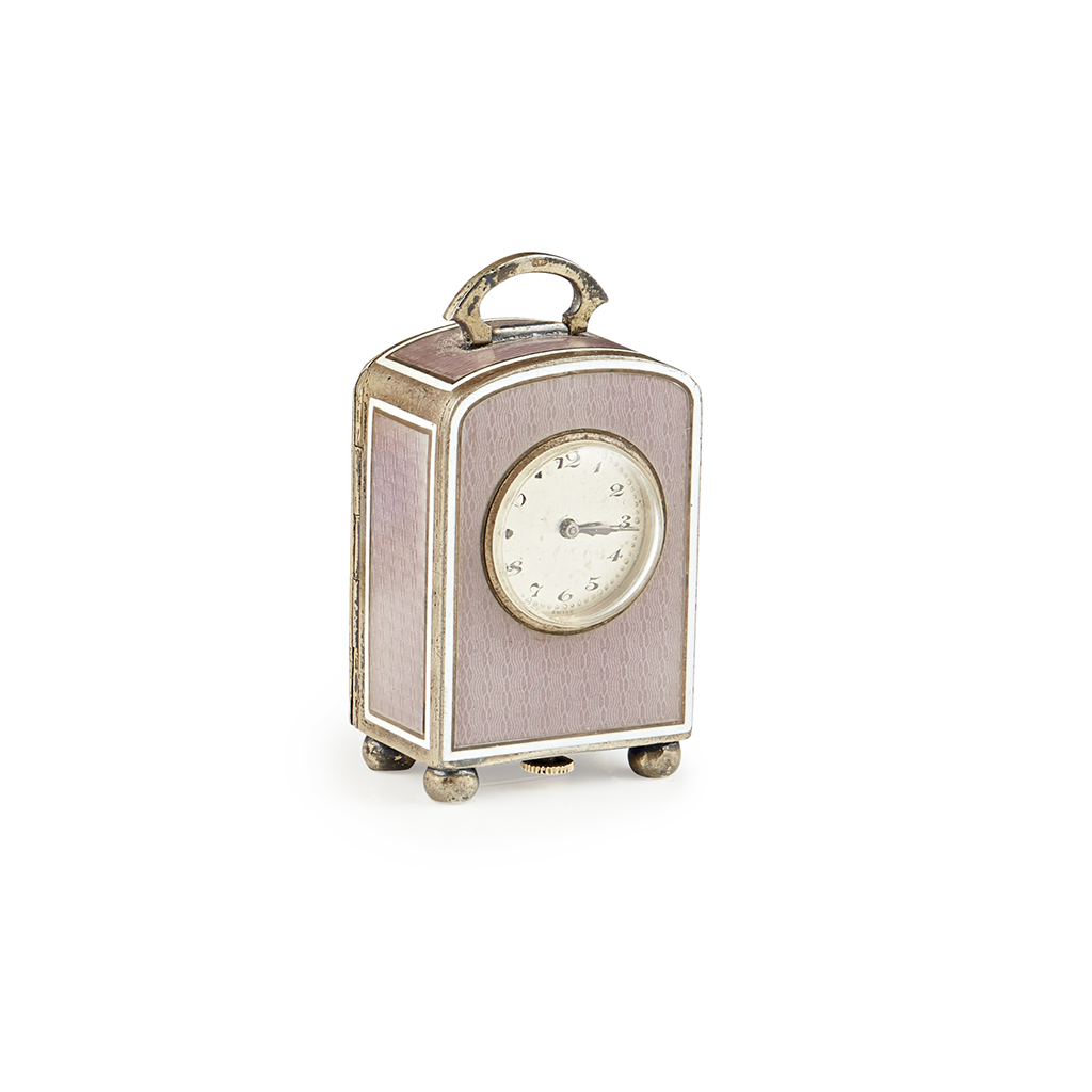 Ateliers Juvenia, circa 1930, the rectangular case with arched top and loop handle, the front panel with lilac guilloche enamel ground, white border, plain silvered dial, Arabic numerals, all raised on bun feet, plain Swiss movement by Juvenia