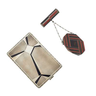 apparently unmarked, the compact of elongated octagonal form, fitted interior and with double chain suspension to the cylindrical lipstick, all decorated in red and black geometric panels, with silver line detail; together with an Art Deco silver and enamel cigarette case, unmarked, the hinged cover with stylised angular 'rays' in black enamel on an engine turned ground, chased and engraved borders and reverse (2)