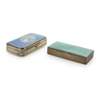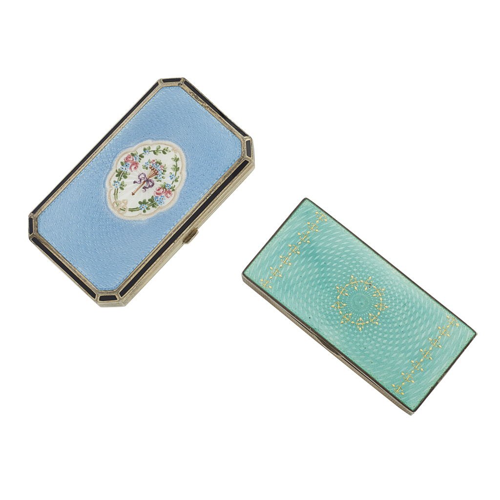 the smaller with indistinct French control mark, the rectangular box decorated with pale green guilloche enamel and gilt highlights, plain thumb piece, the outer case with engine turned decoration, gilt interior and engraved inscription 'Frag Nicht'; the other larger, apparently unmarked, the sprung hinged cover with guilloche enamel ground and central oval of bouquet of spring flowers on a white ground, the canted rectangular body with engine turned decoration, the interior gilt with sprung retainers (2)