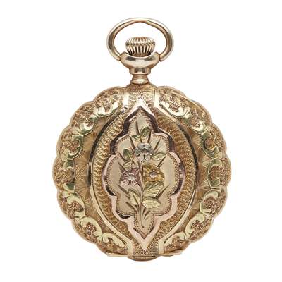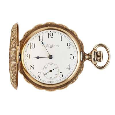 the full hunter case chased with scrolls, foliate design, white enamel dial, Arabic numerals, subsidiary seconds dial, English lever movement