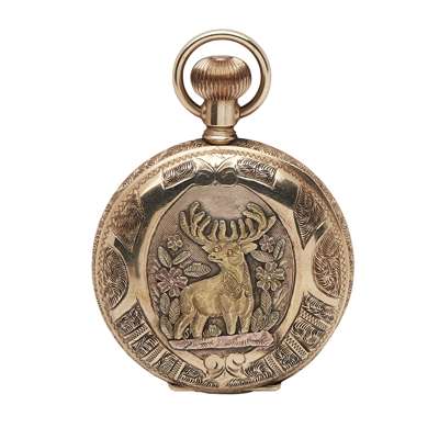decorated with Stag motif in different coloured gold full hunting cases, white enamel dial, inscribed, subsidiary seconds dial, English lever movement, keyless wind