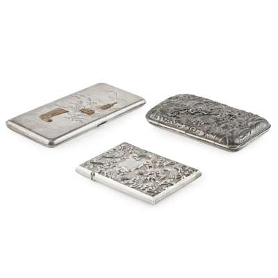 a Chinese export cigarette case, signed with a seal mark and 1000, decorated dragon chasing the pearl to one side, the other engraved monogram; a Japanese rectangular cigarette case with applied copper detail of land and riverscapes with Mount Fuji , signed; a Chinese export card case indistinct seal mark, decorated with and with dragon chasing the pearl in high relief (3)