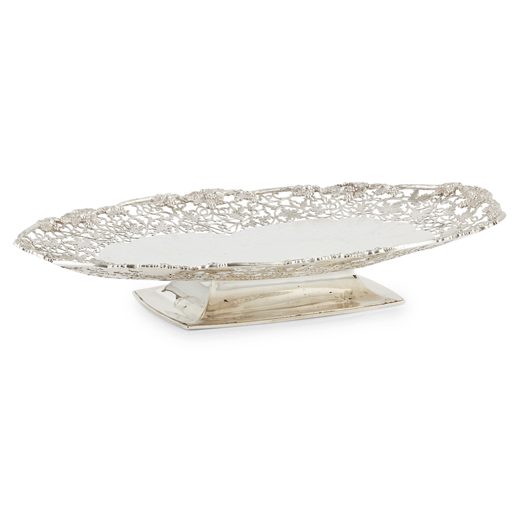 Camelot Silverware Ltd, Sheffield 1991, of rounded oblong form, a wide pierced border with vine detail and cast bunches of grapes to the outer border, all raised on a spreading rectangular foot