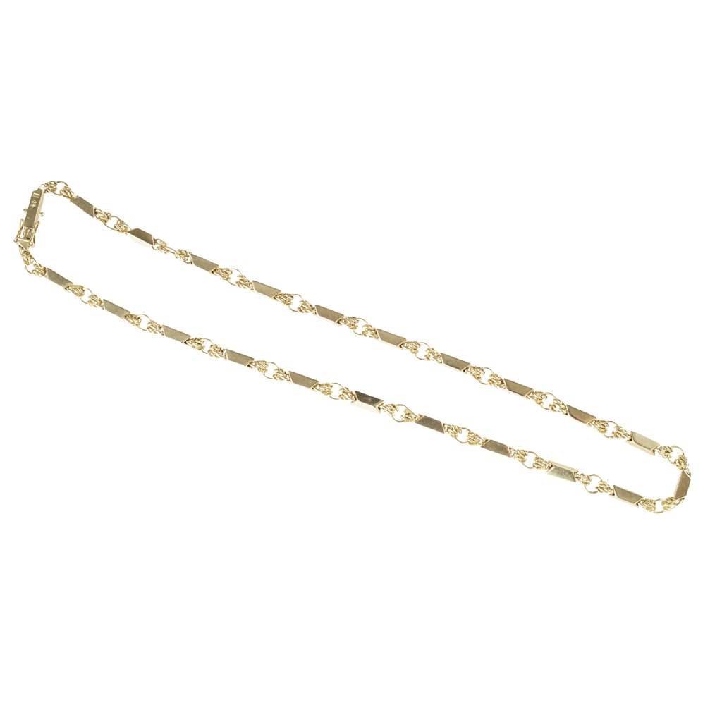 composed of alternating facetted baton and fancy links, to a box clasp, stamped 750