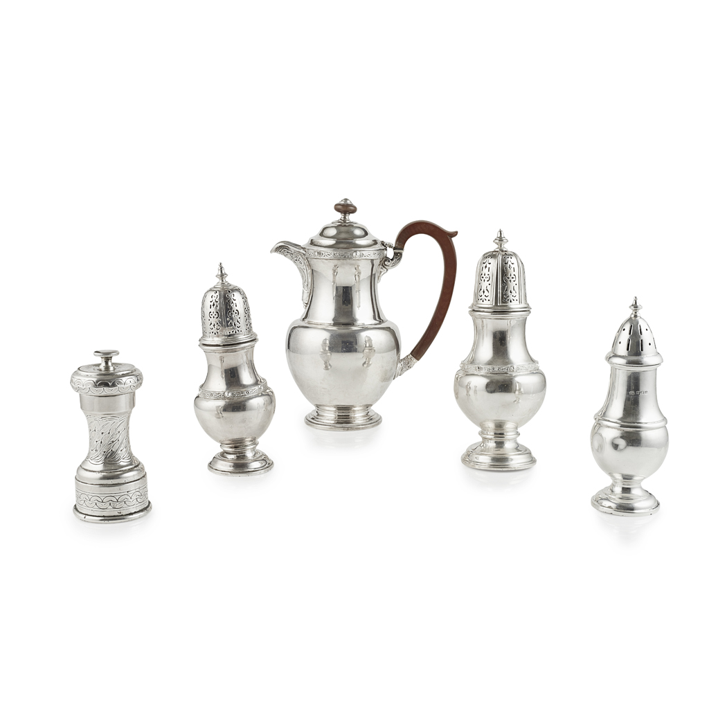 Brook and Sons Sheffield 1932, of baluster form, Celtic border; another smaller similar; a silver pepper mill by Elkington & Co. chased leaf decoration; another plain caster; a water pot, Brook and Sons, of baluster form, Celtic border, pedestal foot (qty)