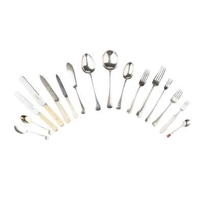 Brook and Sons, Sheffield 1930s, Old English pattern, engraved W, comprising; twelve table and dessert forks; twelve table spoons; eleven dessert spoons; three round serving spoons; six fish knives and forks; six grapefruit spoons, twelve tea spoons, six grapefruit spoons; soup ladle and odd small ancillary spoons ladles etc; set six mother of pearl handled fruit knives and forks; miscellaneous knives etc