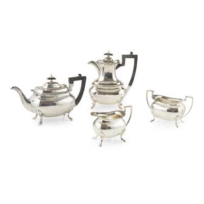 Walker & Hall, Sheffield 1924, comprising waterpot, teapot, twin handled sugar bowl and milk jug, all of oval baluster form, moulded rim, angular handles, raised on scallop legs (4)