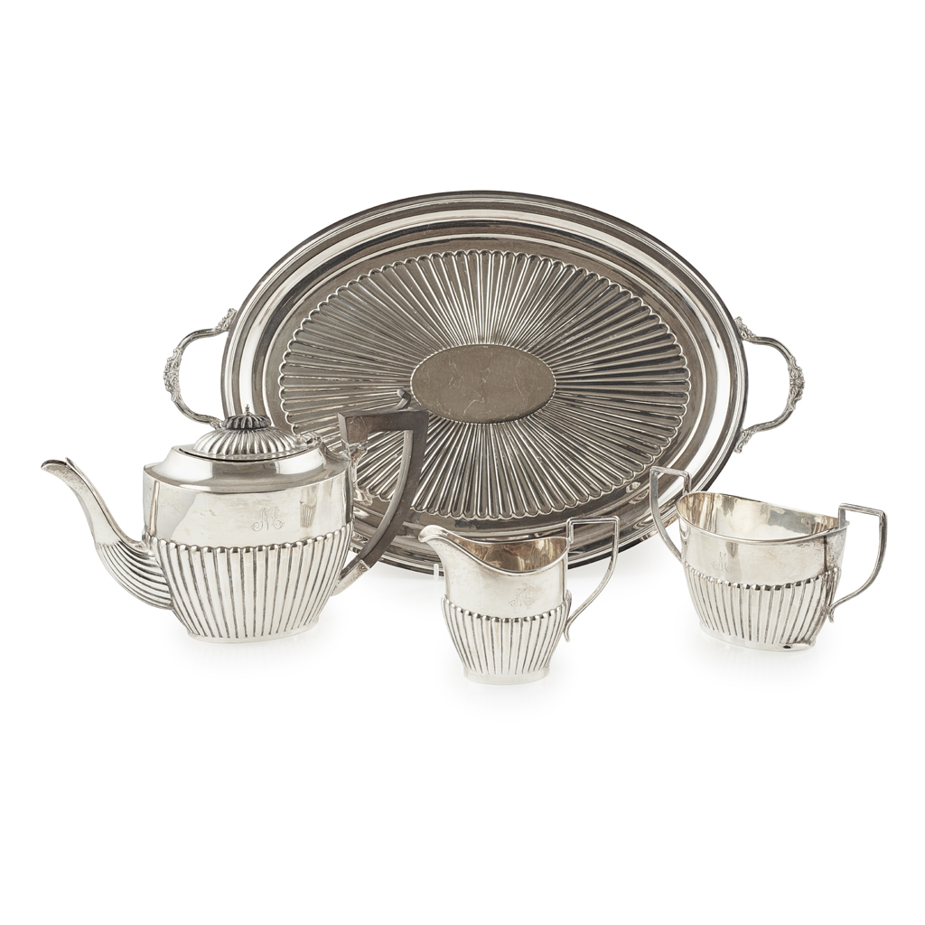 GJ Ltd, Birmingham 1919, of oval form, demi ribbed, comprising a teapot, sugar and basin, with a plated twin handled tea tray similar (4)