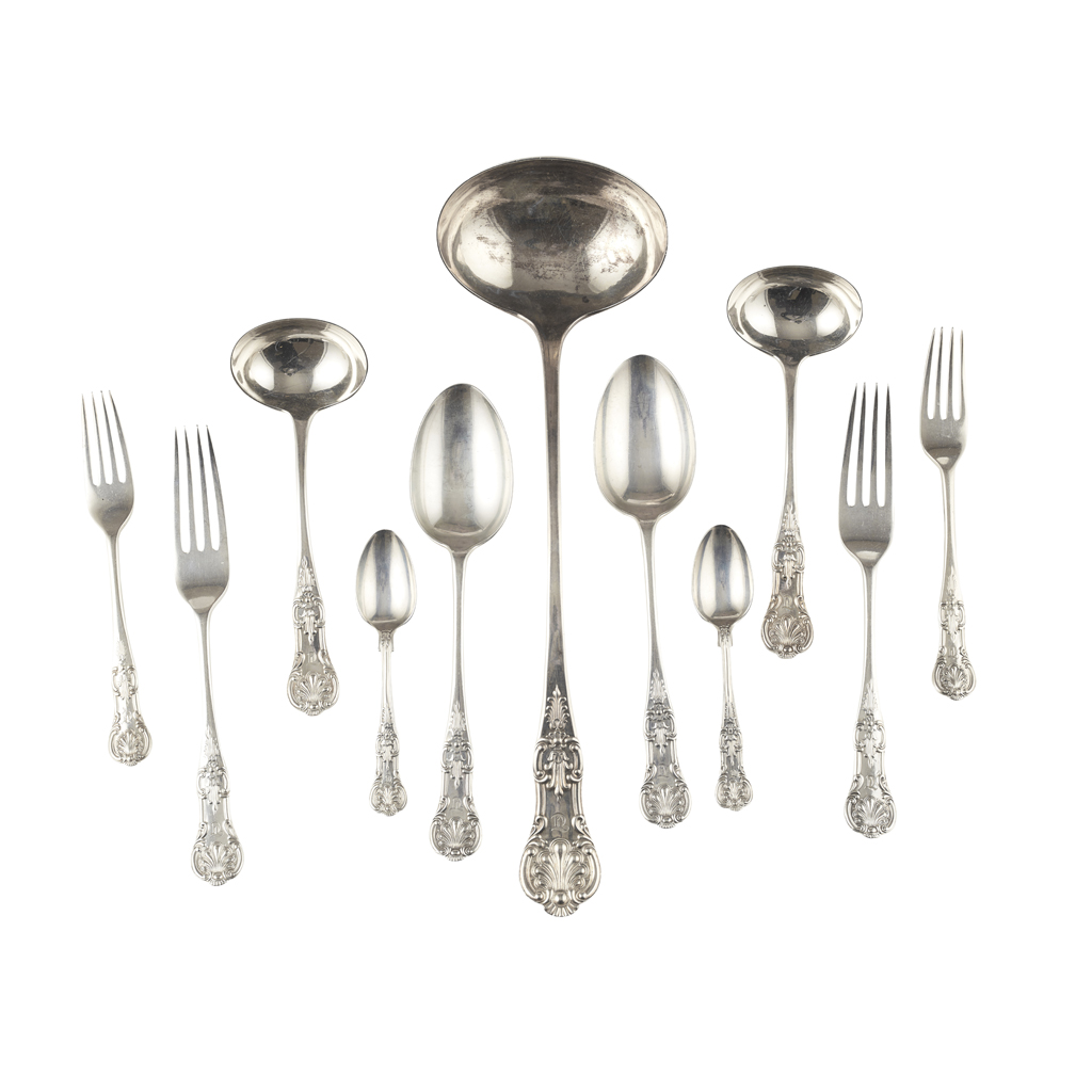 Fenton Russell and Co., Sheffield circa 1907, single struck Queen's pattern, engraved initial 'T', comprising: seventeen table spoons; twelve dessert forks; seventeen dessert forks; eight teaspoons; eighteen table spoons; two sauce ladles and a soup ladle (qty)