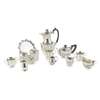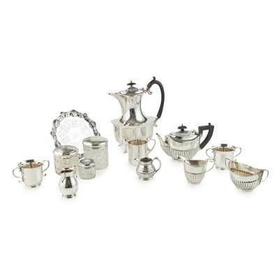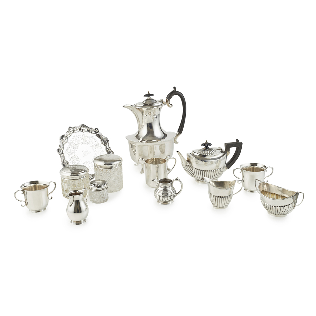 to include; a bachelor's three piece tea service, London circa 1910, oval demi ribbed; a George III small waiter, Richard Rugg, London 1764, shell and scroll border, later engraved flat with initials; modern christening mug; pair small two handled cups; a sparrow beak jug; a small George III cream jug, marks very worn, circa 1760; three silver topped glass jars; and a coffee pot (qty)