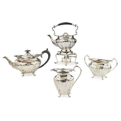 Fenton Russell and Co., Sheffield 1907, comprising; a spirit kettle and stand, teapot, sugar and cream, of oval form, bold serpentine rim, panelled detail to the body, all raised on short feet, engraved initials