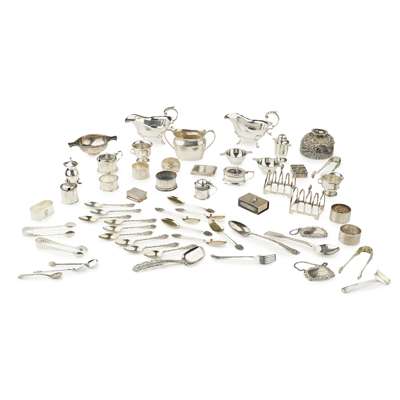 to include; various small quaichs; napkin rings; condiments in sets and part sets; two sauce boats; sugar basin, glass inkwell; cream jugs; toast racks; various small tea, coffee and other spoons, some in part sets, snuff box etc (qty)