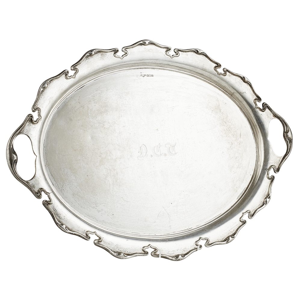Fenton Russell and Co., Sheffield 1907, serpentine oval form, moulded edge, twin handles, engraved initials