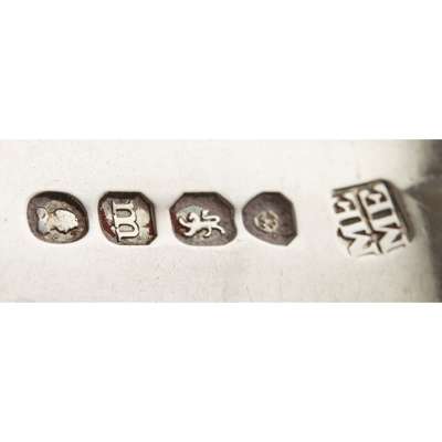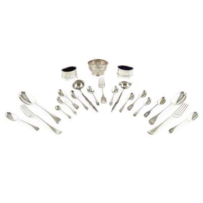 HW Sheffield 1902, Old English pattern, engraved crest (worn), comprising eleven table spoons, nine table forks, twelve dessert spoons, eleven dessert forks, one teaspoon; together with a pair of salts with glass liner; a small Georgian bowl and a collection of miscellaneous flatware including a pair of punch ladles with baleen handles (qty)