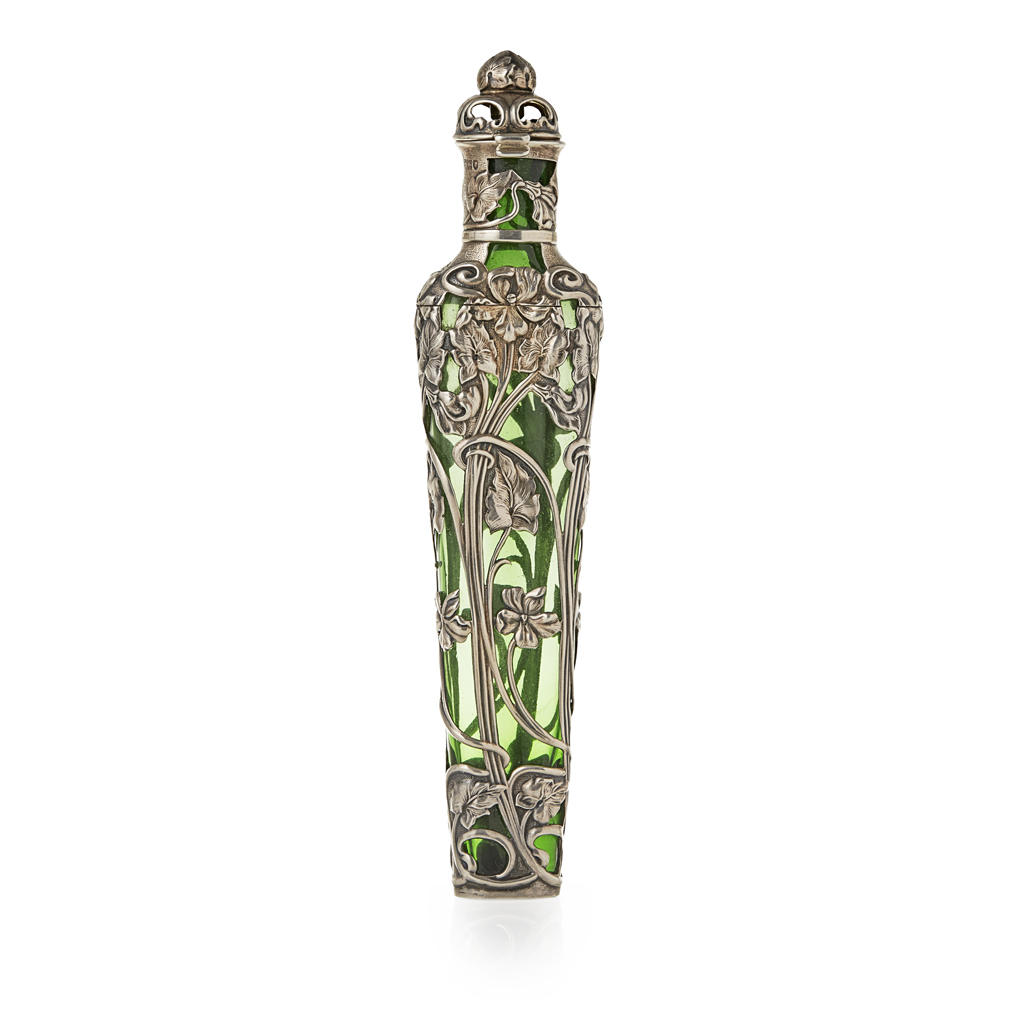Samuel Jacob, London 1901, the tapering green glass bottle enclosed in a bold Art Nouveau scrolling flowers, hinged cover to the small stopper