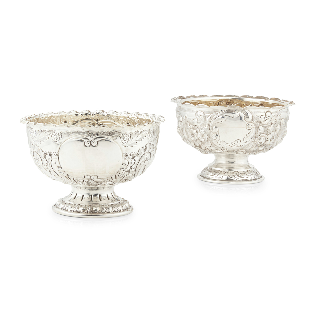 Henry Atkins, Sheffield 1900, of typical hemispherical form with embossed floral decoration, vacant cartouche to either side, raised on spool foot; together with another similar, London 1900
