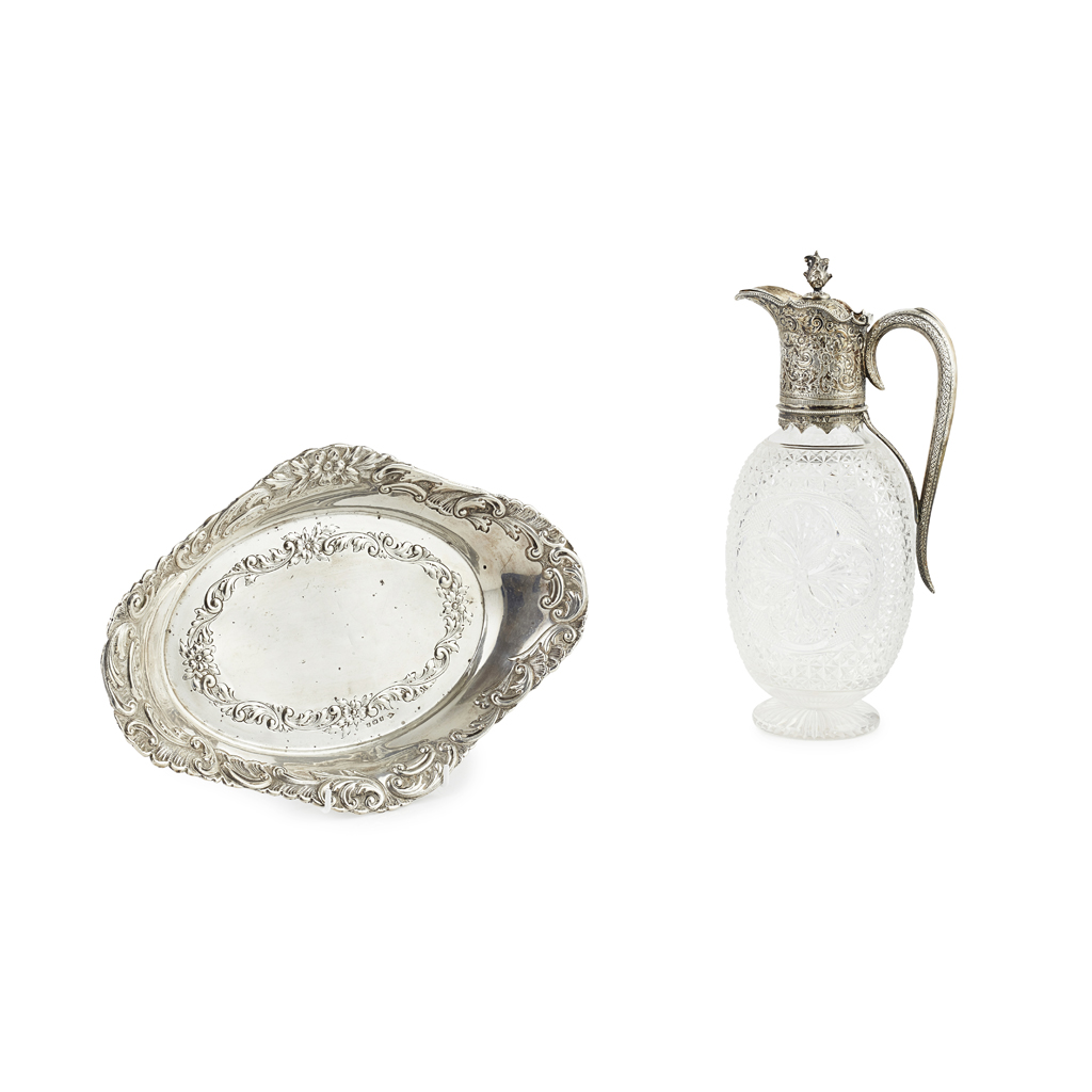 Horace Woodward & Co Ltd, London 1894, the hinged lid with foliate finial, the collar engraved throughout and M to centre, elongated C scroll handle, the glass body with central engraved quatrefoil, spreading glass foot; together with an oval dish, S. Glass (possibly), Birmingham 1906, foliate borders (2)